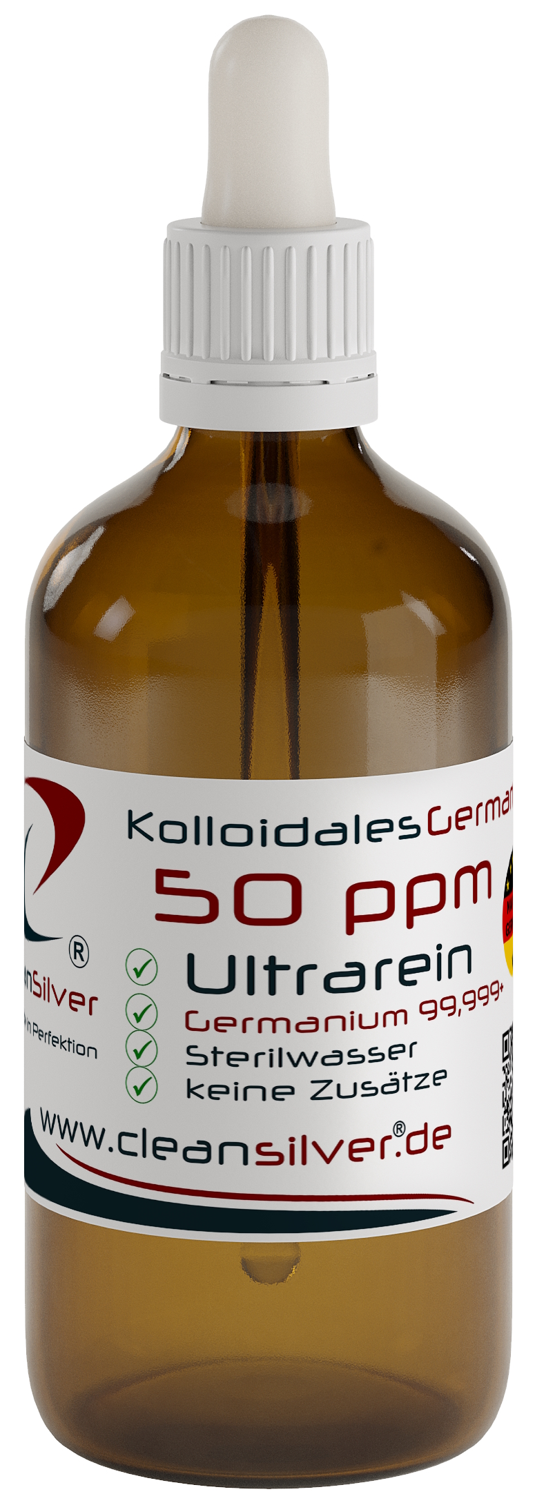 Die Auslieferung von CleanSilver® kolloidalem Germanium erfolgt grundsätzlich in medizinischen Braunglasflaschen*. * DIN 719 bzw. Behältnisklasse III nach DIN 52339-TO180. Herstellung nach ISO 9001 im Reinstraum